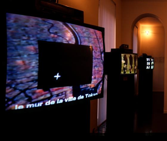 In a circular space in Villa Comunale park, Taormina, a cross-like sign made up of twenty-four monitors is discovered. The cross bears an imprint of the sequence of spaces crossed: stone, river, desert, fiery landscapes. Images stolen during the great escape. Nearby, erasing the satellite images, the new trajectory of the great cursor is video-projected on two mounds, one made of lava stone and the other made of salt.