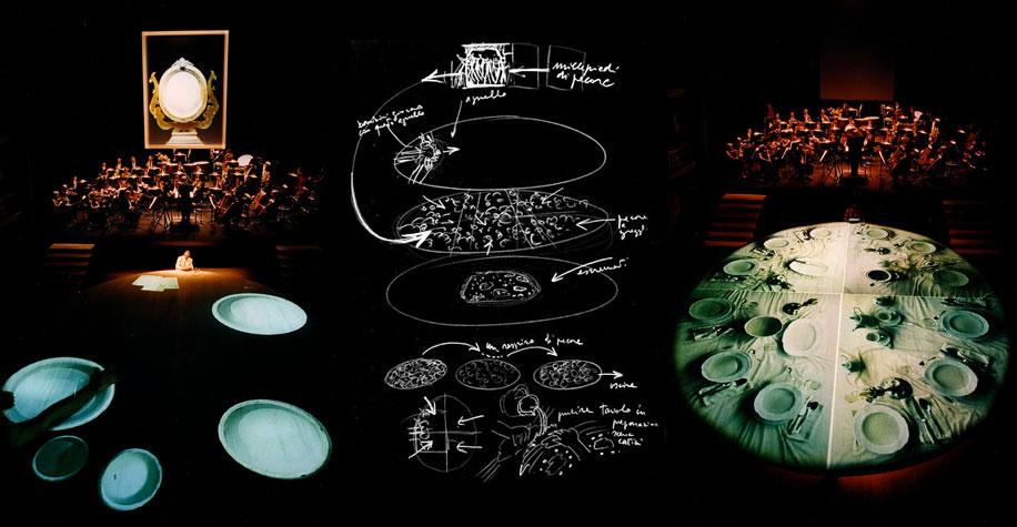 Un’imponente orchestra abbraccia l’unico personaggio in scena: un conferenziere che recita il proprio omaggio alla nascita di Giacomo Leopardi. Davanti a lui, nello spazio della platea, si estende un immenso tavolo: è la scrivania-mondo del poeta su cui gli spettatori, dalle balconate, possono osservare il susseguirsi delle immagini.