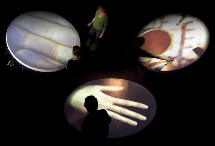 Le mani dei visitatori colpiscono altre mani, proiettate sulle membrane di larghi tamburi interattivi. Ne toccano i palmi – giovani e vecchi, curati o segnati dal lavoro. Le superfici percosse provocano suoni e scuotono le immagini. Sono segnali da tam-tam che invitano a esplorare le mani proiettate e a cercare, come su una carta geografica, i segni e le tracce di vita delle persone a cui appartengono. A un tratto, tra le pieghe della pelle, si scopre un piccolo oggetto, che con un gesto viene offerto. La mano si ritrae, impugnando il piccolo dono simbolico e inviandolo in modo casuale nel web.