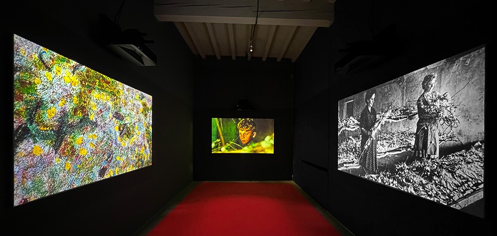 Un trittico composto dalle scene rappresentative del susseguirsi ciclico delle stagioni al centro, mentre le immagini che affiorano dalla vista periferica, da un lato sono fotografie dell’epoca che emergono come ricordi di infazia, dall’altro sono i colori, le campiture, le sfumature cromatiche della pittura, che hanno probabilmente ispirato la luce del film.